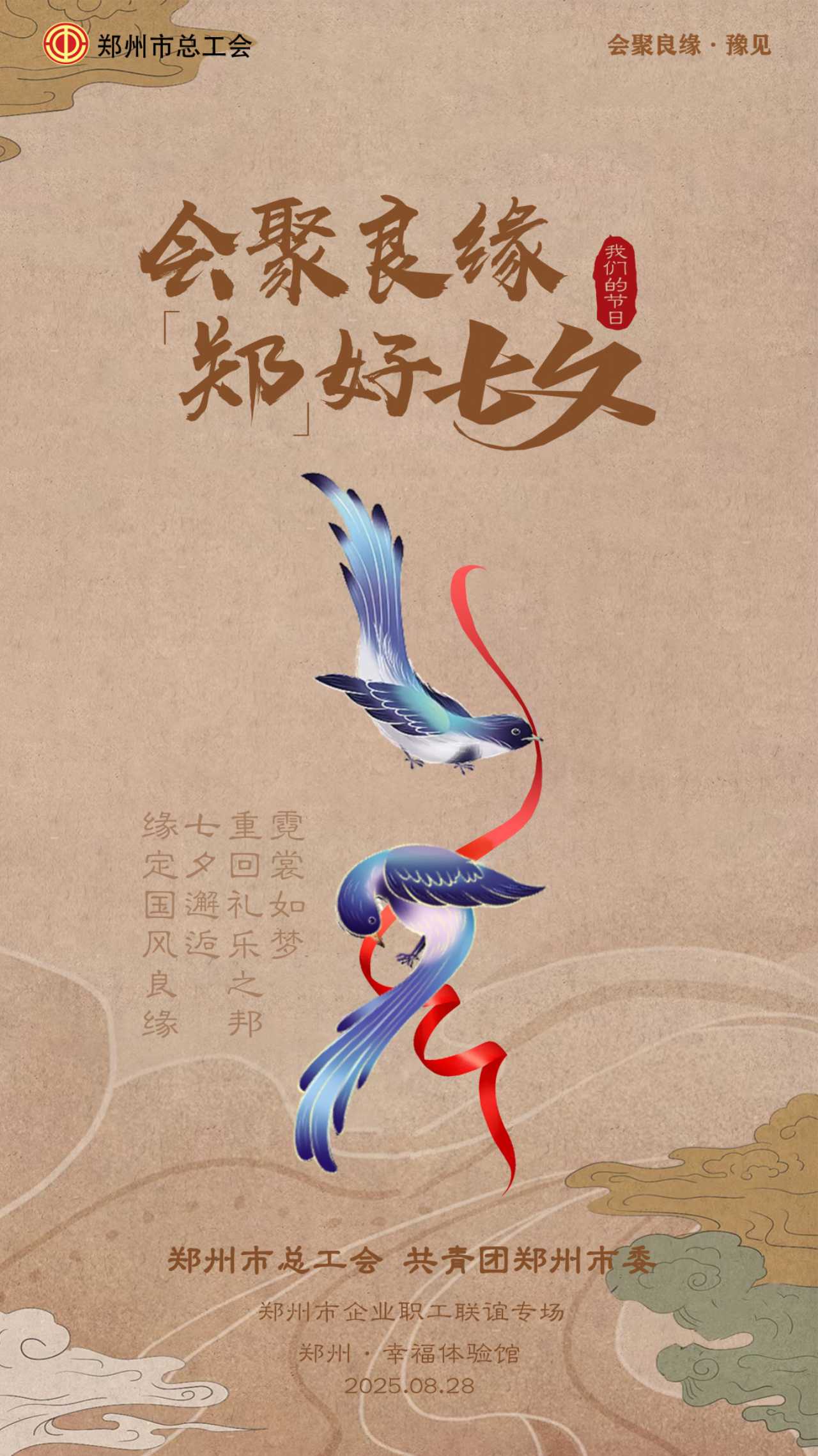 一见倾心,缘定七夕。在这充满东方浪漫色彩的传统节日,郑州市总工会联合共青团郑州市委,依托2025年度浪漫IP【职工爱情基地】,特别推出“会聚良缘·‘郑’好七夕”国风主题派对!暂别繁忙,8月28日(周四)晚7点半,欢迎来到市总工会幸福体验馆,共赴一场跨越星河鹊桥的心动之约。