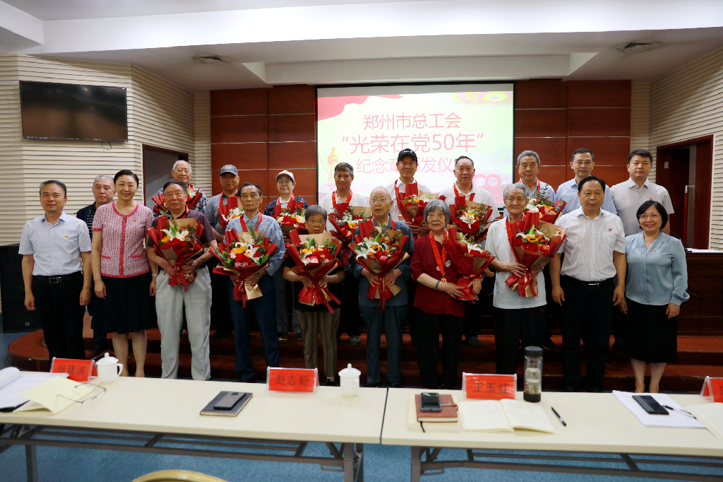 6月18日,郑州市总工会举行“光荣在党50年”纪念章颁发仪式,向市总工会党龄五十年以上党员代表颁发“光荣在党五十年”纪念章。市一级巡视员、市总工会党组书记、主席赵新中出席仪式并为党员代表颁发纪念章。13名获得纪念章的党员代表参加颁发仪式。