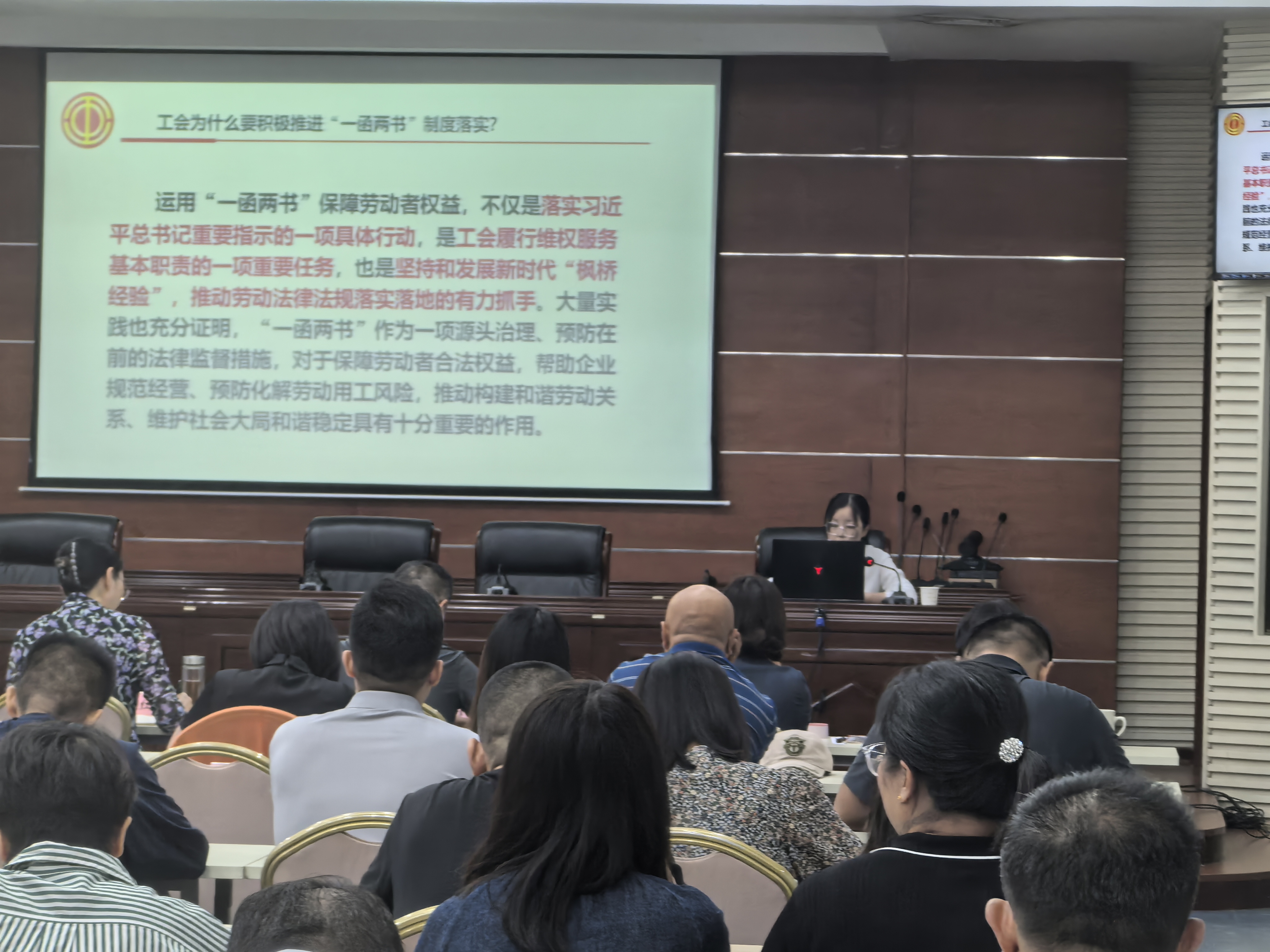 市总工会法律工作部黄煜从“一函两书”制度基本内涵、制度建设的意义、工作部署、关于工会法律工作的思考四个方面详细讲述了用好“一函两书”制度打造工会新“枫”景的重要意义。