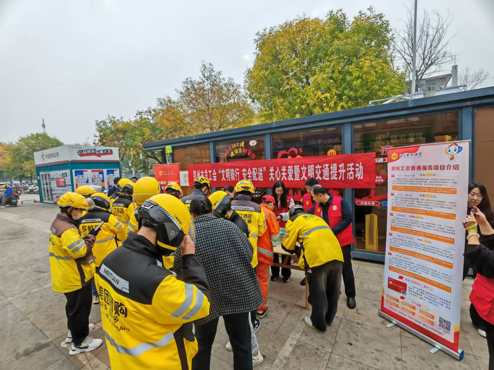 为积极响应国家关于提升公民交通安全意识的号召,引导网约配送员成为文明出行的践行者、文明风尚的引领者、文明建设的参与者,近日,郑州市总工会多个党支部联合郑州市各区8个工会驿站、近20个外卖配送站点、快递站点,组织开展了9场“文明交通”宣传活动。