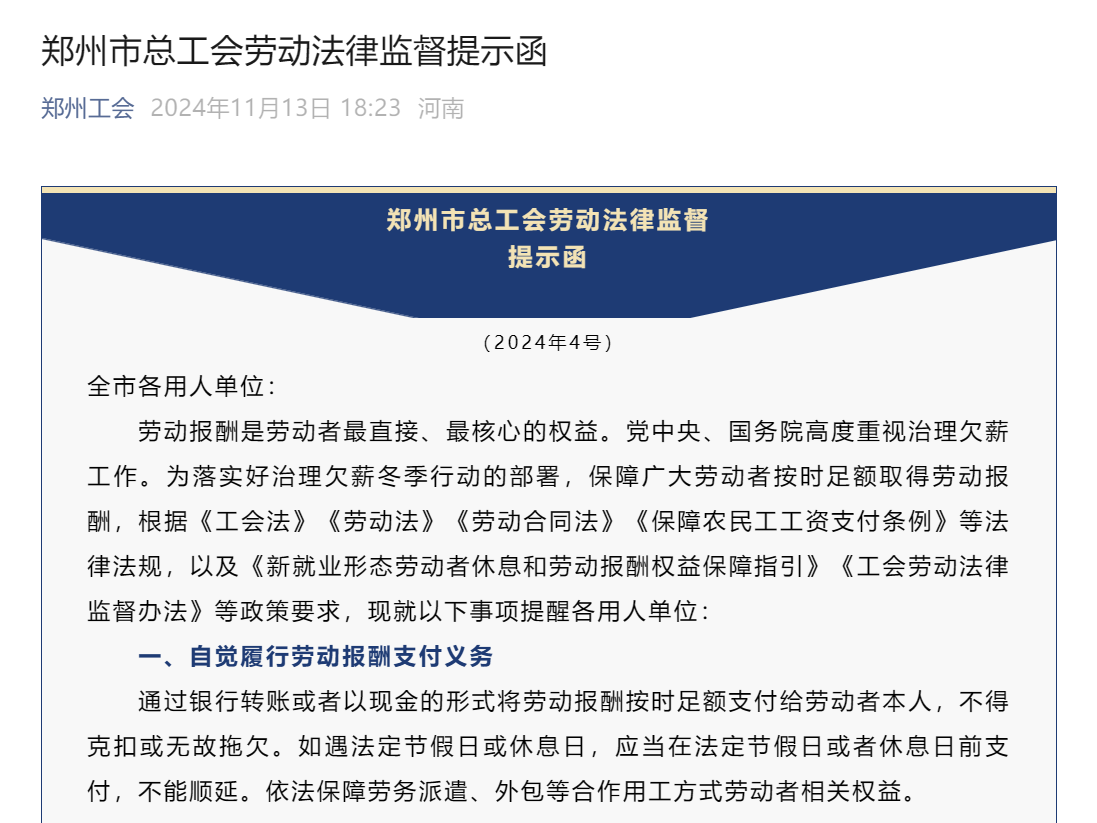 治理欠薪冬季行动打响,郑州市总工会劳动法律监督委员会11月13日向全市用人单位发出劳动法律监督提示函,通过贯彻落实劳动保障法律法规,协同推进运用“一函两书”制度,保障广大劳动者按时足额取得劳动报酬。此前,郑州市总工会根据《工会法》《劳动法》《劳动合同法》《安全生产法》等法律法规,以及《新就业形态劳动者休息和劳动报酬权益保障指引》等政策要求,发出提示函55份、监督意见书21份,就相关事项予以提醒。