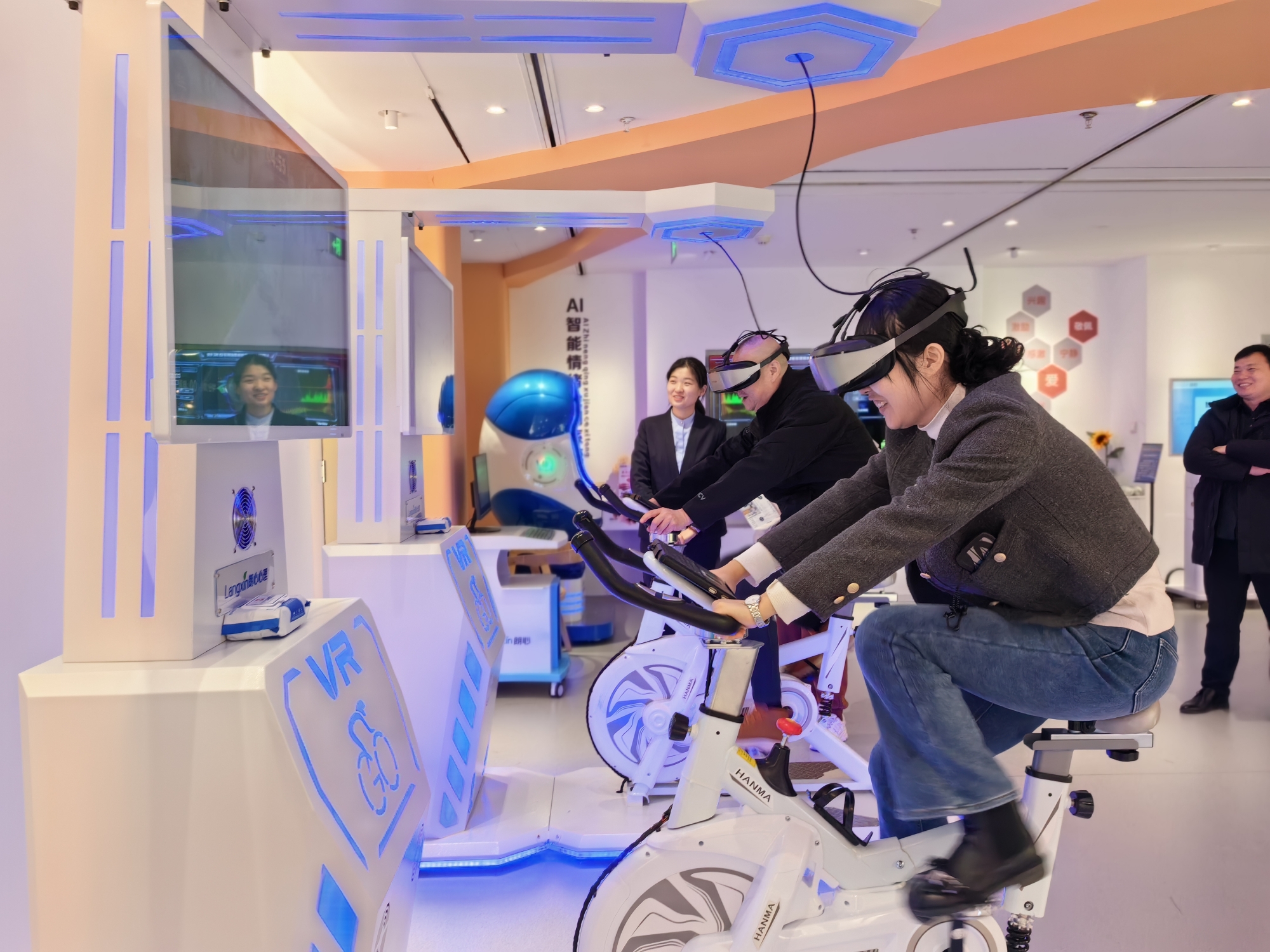 大家按照工作人员的引导,相继体验了“微笑打卡”“心花怒放”“动感单车”等项目,用心感受着专业、系统、多样化的心理健康服务,不时传来一阵阵欢笑声和惊呼声。走进正念减压室,一地白色的圆球瞬间引起了大家的注意,在工作人员的指导下,大家纷纷戴上头带,随着脑电波通过无线设备的传输,每个人手中的白球变成了不同的颜色。工作人员讲解说,球的颜色显示了每个人当前的脑电波情况,紫色代表紧张,青色代表平和,蓝色代表放松。在心理辅导师的语言引导下,大家通过身心合一的冥想,在舒缓的环境中完全放空自己,沉浸体验,最终大家手里的球全部变成了蓝色。这样的体验非常有利于职工释放心理压力,缓解焦虑,达到一个最佳的精神状态。