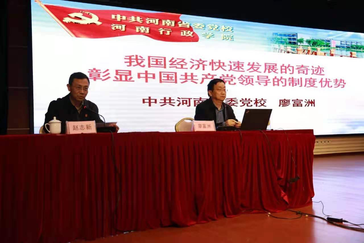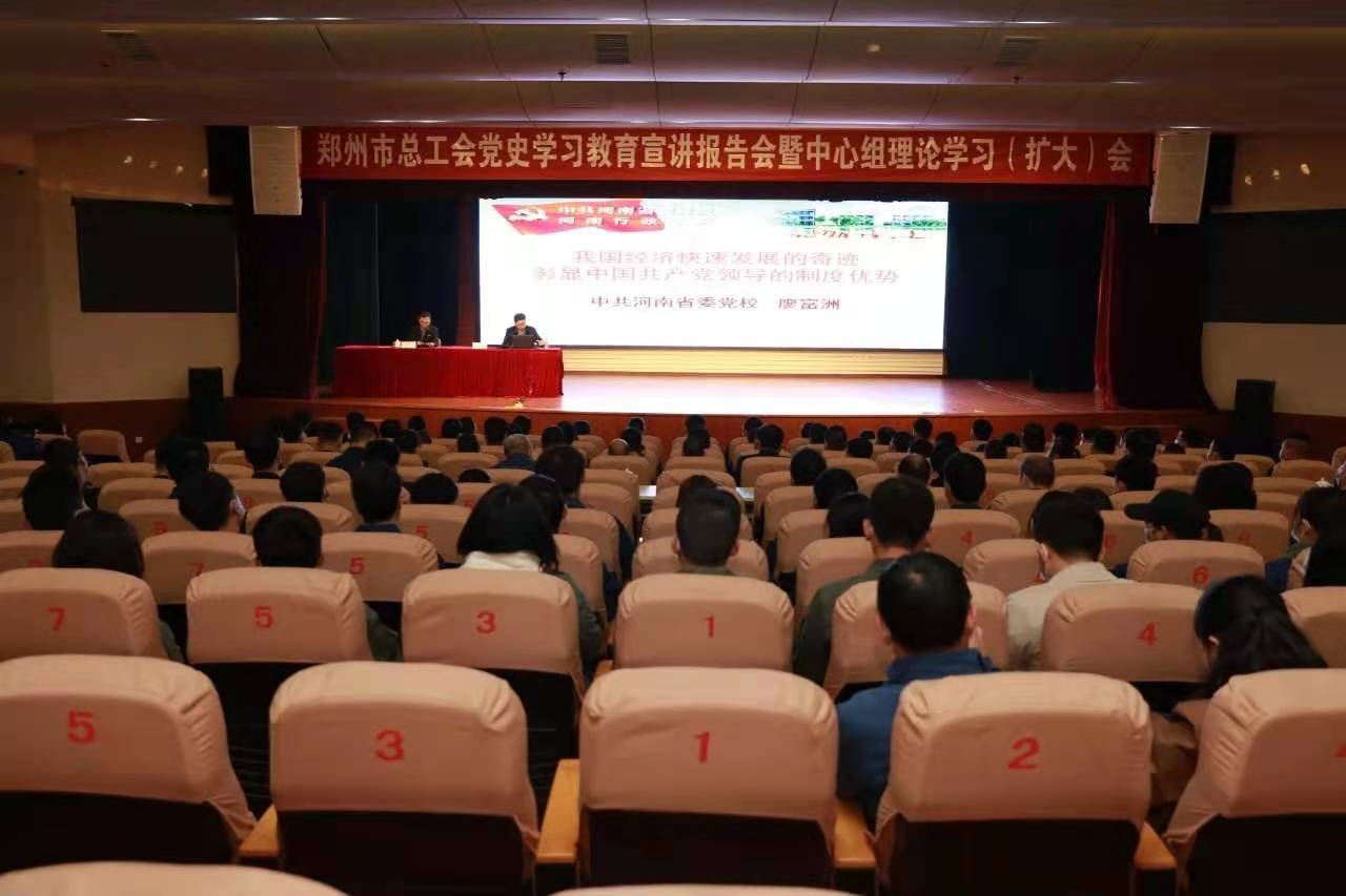 4月23日,郑州市总工会召开党史学习教育宣讲报告会暨中心组理论学习(扩大)会,邀请省委党校(河南行政学院)校委委员、教授廖富洲作宣讲报告。市总工会党组中心组成员、市总副县处级以上领导干部,市总机关各部(处)室、各产业工会、各直属事业单位全体人员和相关基层单位职工代表300余人参加了报告会。