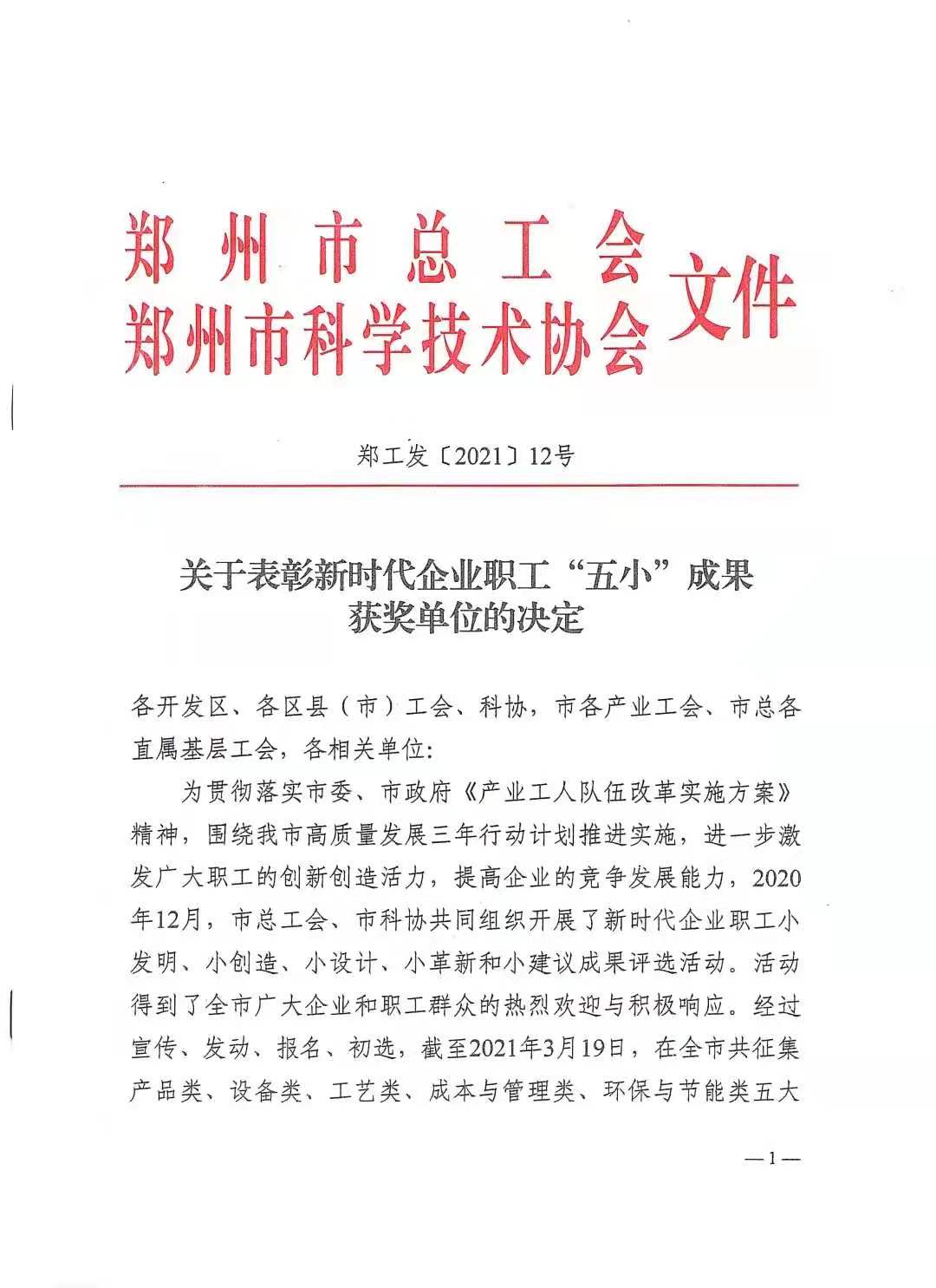 为贯彻落实《郑州市产业工人队伍建设改革实施方案》要求,围绕郑州市高质量发展三年行动计划推进实施,激发职工创新创造活力、提升企业发展竞争力,市总工会、市科协与2020年12月共同组织开展了郑州市新时代企业职工“小发明、小创造、小革新、小设计、小建议”成果评选活动。活动得到全市广大企业和职工群众的热烈欢迎与积极响应,仅3个多月时间,就征集到617个项目。经过全市新时代企业“五小”成果评选组委会组织专家组分项初审、现场考察、重点陈述、质疑答辩、综合评审等一系列环节,最终评出一等奖10项、二等奖20项、三等奖30项和优秀奖88项,市总工会、市科协联合行文表彰,并分别给予一等奖一万元、二等奖六千元、三等奖四千元奖金奖励。