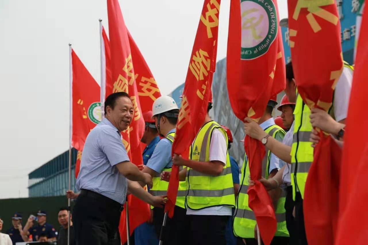 启动仪式上,在工地现场开展了消防救援应急演练和安全生产演练。消防救援演练环节模拟施工现场发生火灾时,现场管理人员应急操作反应及配合市消防救援支队展开灭火救援的案例;安全生产演练环节模拟职工中暑后应急操作。整个演练过程人员到位快速、现场组织严密、操作程序得当,达到了预期效果。宣誓环节,由中建二局代表引领各参赛单位代表共同开展安全宣誓。赵新中为各参赛单位授旗。