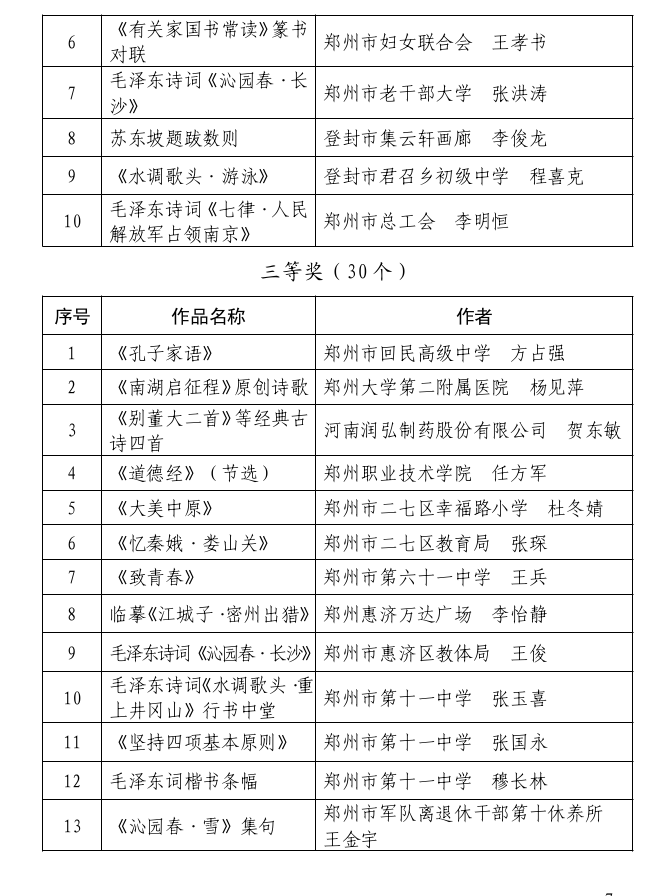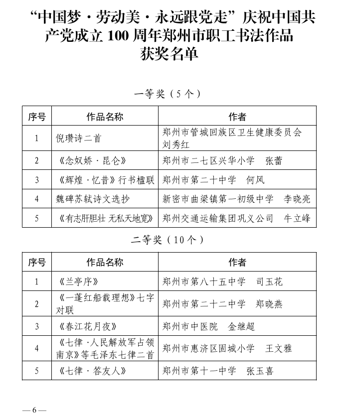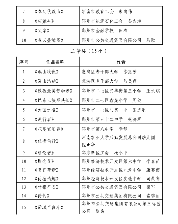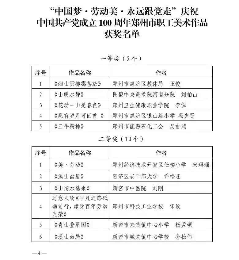 本次展览得到各级工会和广大职工美术、书法爱好者的积极响应,共收到参展作品 291 件,含美术作品 64 件,书法作品 227 件。经组织美术、书法相关领域专家认真评审,报经活动组委会同意,共评选出获奖作品 75 件。其中,一等奖 10 件,美术 5 件、书法 5 件;二等奖 20 件,美术 10 件、书法 10 件;三等奖 45 件,美术 15 件、书法 30 件。郑州市总工会、郑州市文学艺术界联合会、郑州市美术家协会、郑州市书法家协会联合行文表彰,并将为获奖作品颁发相应证书、奖品。