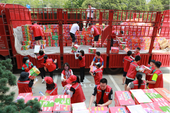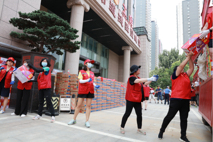 上午9:00,三辆挂着“河南加油”的大卡车驶进市职工之家院内,浙江绍兴轻纺城河南商会、上海蛮啾网络科技公司、河南苏宁易购等爱心组织、企业捐赠给郑州职工的防汛救灾物资如约而至。但2000件纯净水、1000箱方便面、500箱罐头、500箱八宝粥等一批生活物资卸车和搬运让已经连续奋战几天的市总工会干部职工赶到力不从心,情急之下,市总工会拔打了郑州市志愿者联合会的电话,迅速组建起“绿城惠惠”职工志愿服务工作群。短短20分钟,职工之家附近的志愿者就聚集起20多人的队伍。这些志愿者大都是在职职工,有的是教师,有的作房产中介,有的从事保险销售,很多人互相并不熟悉,但“奉献、友爱、互助、进步”的志愿服务精神把他们凝聚在一起,风雨同舟、守望相助的爱心支援不断激发他们的内在力量。志愿者张鑫表示,他们志愿服务的组织就叫做SOS高效救援队,这几天一直在荥阳、市委党校、奥体中心、郑上路小学从事救灾物资搬运支援服务,听到群里求助信息,他立刻就和四名同事赶来了,为防汛救灾出把力、流流汗,是一名郑州职工份内的事。