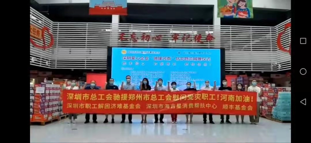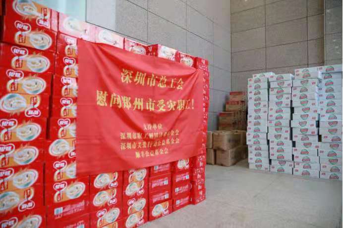 这是深圳市总工会下属的深圳市职工解困济难基金会发动爱心企业、慈善组织为郑州市职工捐赠的第一批救灾物资。深圳距离郑州1600公里,距离阻隔不了两地工会间的热线联系,距离阻隔不了两地职工的深情厚谊。7月23日,深圳市总工会副主席侯圣海主动给郑州市总工会副主席杜建新打来电话,询问持续强降雨给郑州市企业和职工带来的损失,转达了深圳市广大职工对郑州市职工的关心和问候,表示将通过深圳市职工解困济难基金会发动爱心企业、慈善组织为郑州市职工捐赠救灾物资,支持郑州企业和职工积极自救、共渡难关、迅速恢复生产生活秩序。杜建新第一时间向郑州市总工会党组作了汇报,郑州市总工会党组为深圳市总工会千里驰援、爱心捐赠、共渡难关的大爱所感动,周六专题召开会议,研究了接受爱心救灾物资方案和第一时间分发慰问受灾企业、职工的措施。