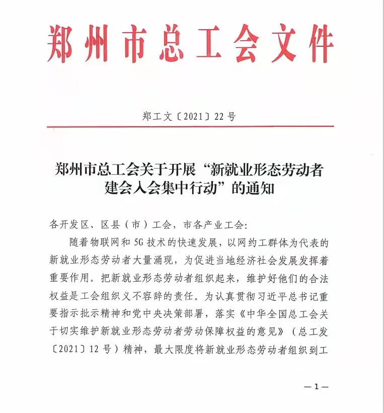 根据实施方案,郑州市各级工会主要领导亲自抓,成立工作专班具体抓,以货车司机、网约工、快递员等群体为重点,切实摸清本地区电商平台企业、共享平台企业、创客空间企业等新就业形态企业应建未建工会的底数;结合各地实际情况,及时科学制定后续建会入会时间表、路线图和责任书;开展新就业形态劳动者建会入会集中行动,重点推动平台企业在本地分公司及加盟公司建会,带动新就业群体入会。通过“单独建会”“联合建会”“行业建会”“区域建会”等多种方式,扩大工会组织覆盖面;大力推行“行业覆盖、区域兜底”模式,将行业(区域)工会作为吸收新就业形态劳动者入会的重要渠道,着力建设一批以覆盖新就业形态劳动者为主的县级、市级行业工会联合会,推进快递物流园区特别是国家级、省级物流园区普遍建立工会组织,扩大有效覆盖。