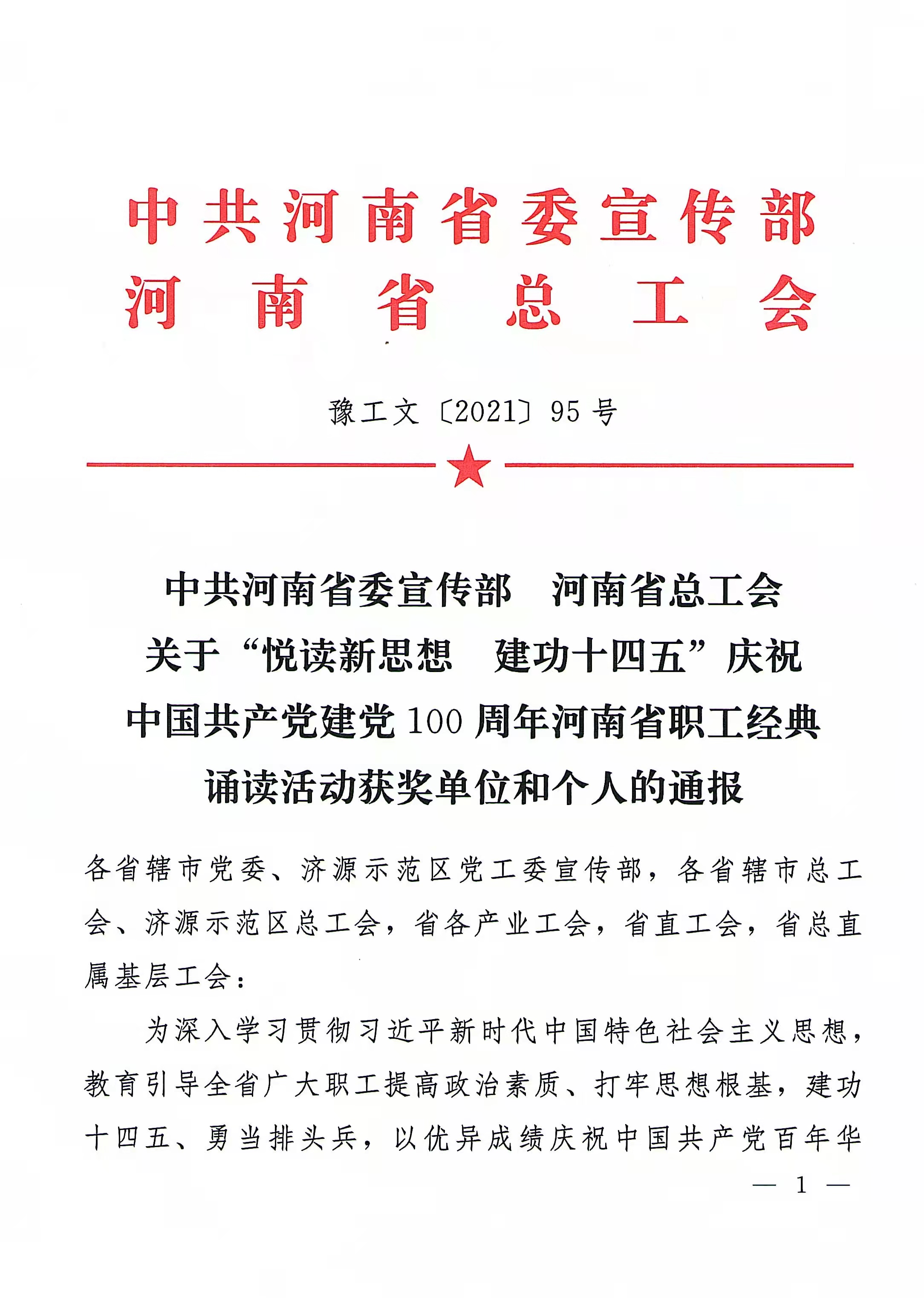 为深入学习贯彻习近平新时代中国特色社会主义思想,教育引导全省广大职工提高政治素质、打牢思想根基,建功十四五、勇当排头兵,以优异成绩庆祝中国共产党百年华诞,2021年,中共河南省委宣传部、河南省总工会联合开展了“悦读新思想 建功十四五”庆祝中国共产党建党100周年河南省职工经典诵读活动。全市各级工会组织积极响应、精心谋划,结合党史学习教育、党的创新理论宣讲,组织开展形式多样的群众性读书活动,共报送120个诵读视频,市总工会择优推荐10个作品参加此次活动评选。