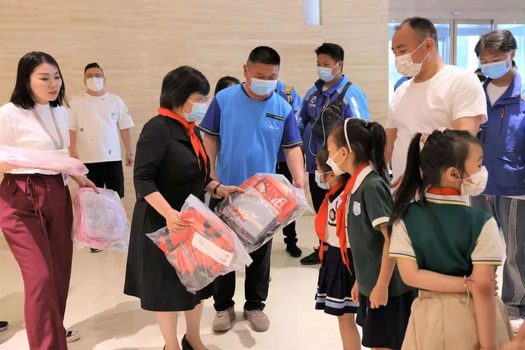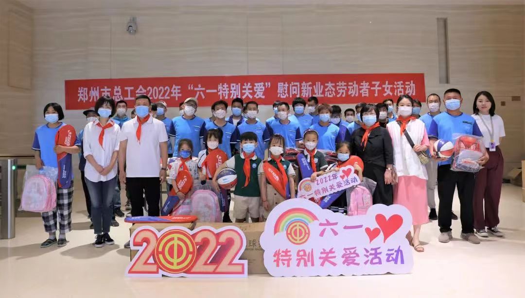 5月30日下午,郑州市总工会举办2022年“六一特别关爱”慰问新业态劳动者子女活动,郑州市总工会女职工委员会主任靳荣欣、副主席许振亚看望并慰问“饿了么”郑州分公司困难骑手家庭的孩子,为他们送去了书包、体育用品和防疫口罩。