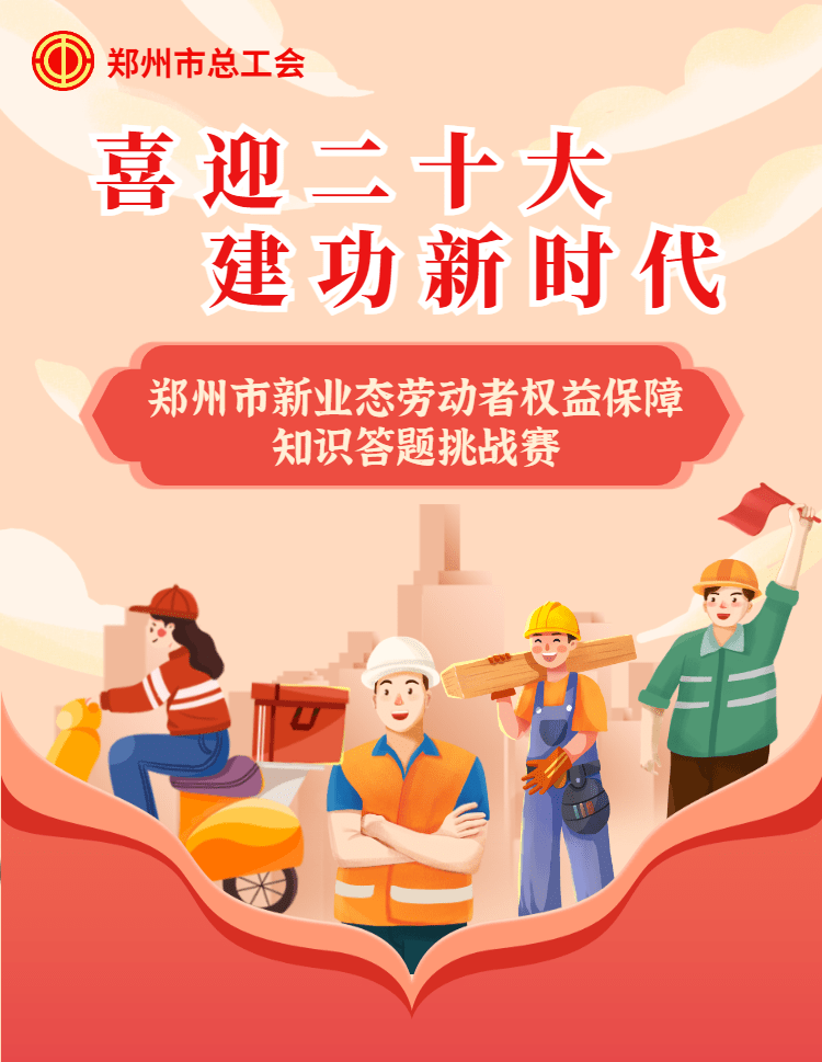 10月10日至12日,郑州市总工会推出“喜迎二十大,建功新时代”新就业形态劳动者权益保障知识答题挑战赛,更好地宣传动员全市新就业形态劳动者加入到工会组织中来,享受工会组织的服务,感受工会组织的温暖。