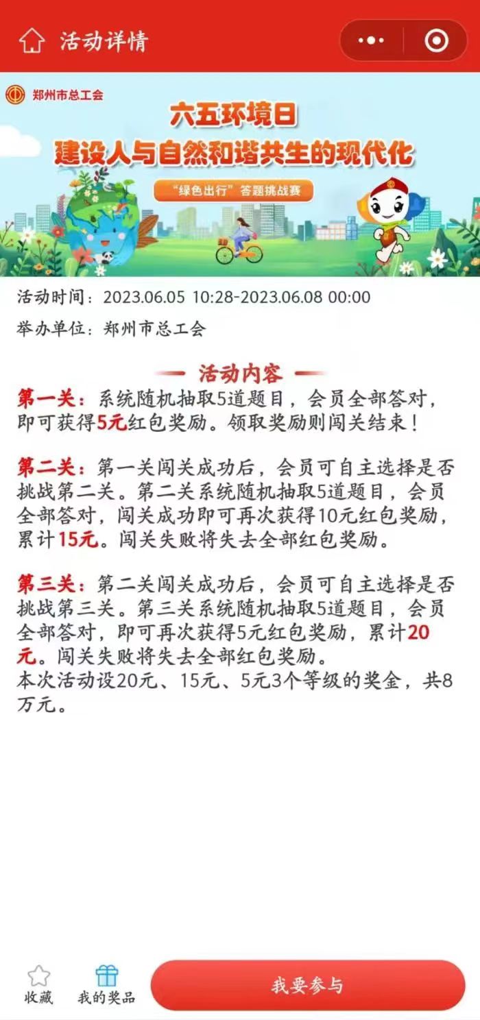 本次活动时间为期3天,从6月5日至6月7日,市总工会投入奖金8万元。活动期间,工会会员在微信平台参与闯关答题,连续答对3个关卡就有机会获得最高20元的现金红包。