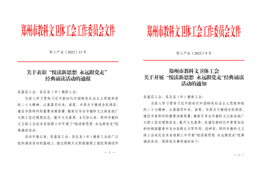 为深入学习贯彻习近平新时代中国特色社会主义思想和党的二十大精神,认真落实中央、省委、市委关于推进全民阅读、建设书香郑州的重要决策部署,教育引导全市教科文卫体系统广大职工坚定理想信念、提升文化素养,4月份以来,按照市总工会部署,市教科文卫体工会在本系统职工中开展了“悦读新思想 永远跟党走”经典诵读活动。