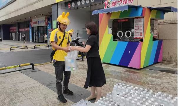 在石佛华强广场“七彩”暖心驿站,慰问组为美团骑手、快递员送去了矿泉水、清凉油、风油精、人丹等防暑降温大礼包,为高温下辛苦工作的外卖骑手和快递员送去清凉和关怀,叮嘱大家要加强自我防护,注意防暑降温。