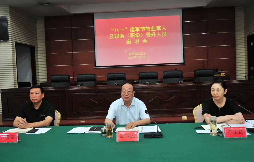 7月31日,郑州市总工会机关召开庆祝“八一”建军节 转业军人及职务(职级)晋升人员座谈会。市人大常委会副主任、市总工会主席周亚民出席会议并讲话,市总工会党组书记、常务副主席王玉红主持会议,市总领导班子成员、机关产业在职转业军人,今年以来职务(职级)晋升人员参加会议。
