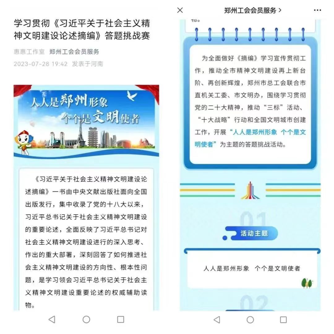 为全面做好《习近平关于社会主义精神文明建设论述摘编》学习贯彻工作,推动全市精神文明建设再上新台阶,7月28-7月30日,郑州市总工会联合市直机关工委、市文明办,围绕学习贯彻党的二十大精神、推动“三标”活动、“十大战略”行动和全国文明城市创建工作,依托“郑州工会会员服务”微信公众号开展了以“人人是郑州形象 个个是文明使者”为主题的网上答题挑战赛活动。