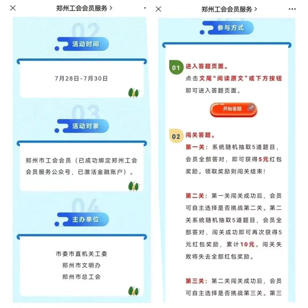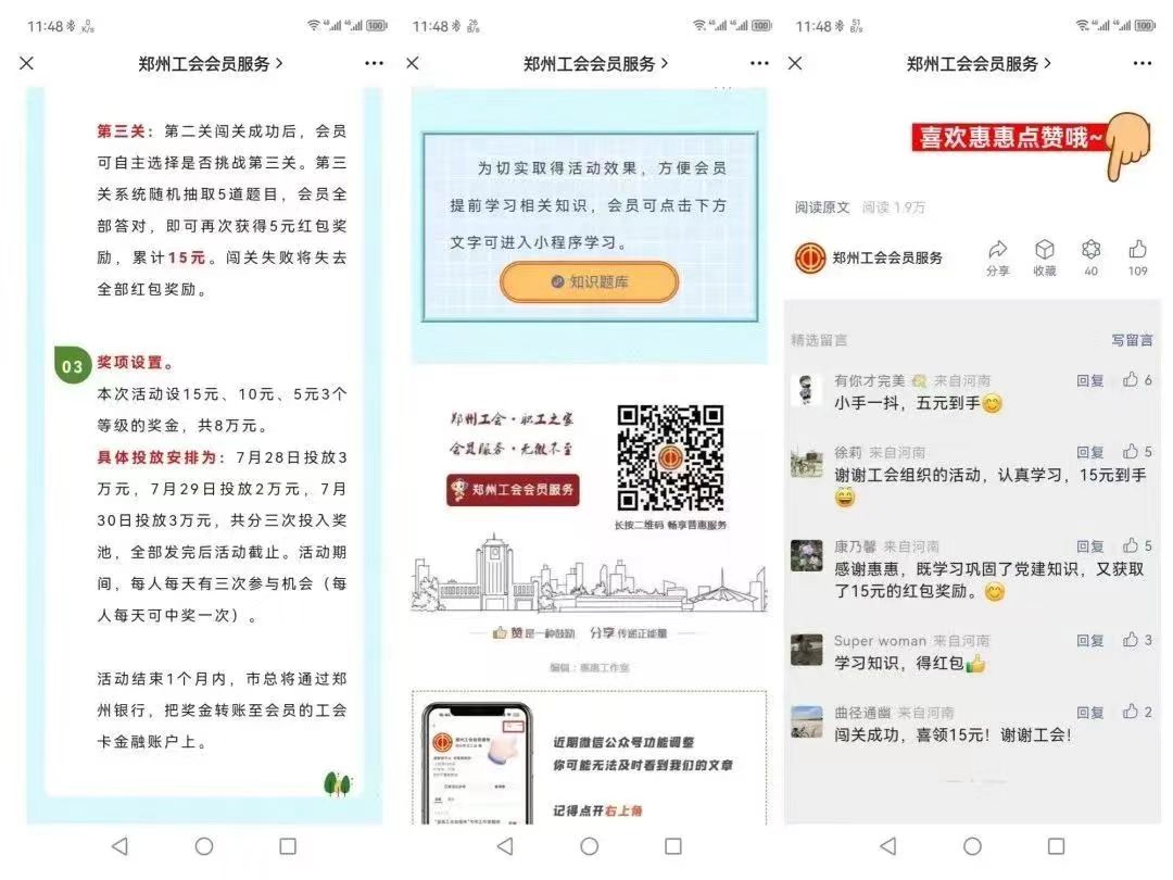 此次活动共投入8万元,设15元、10元、5元3个等级的奖励,分三次投入奖池,挑战赛分为三关,闯关成功便可获得相应奖励,活动结束1个月内,市总工会将通过郑州银行把奖金转账至会员的工会卡金融账户上。为确保活动取得实效,方便参与者学习相关知识,市总工会还在微信公众号推文下方链接了知识题库小程序。