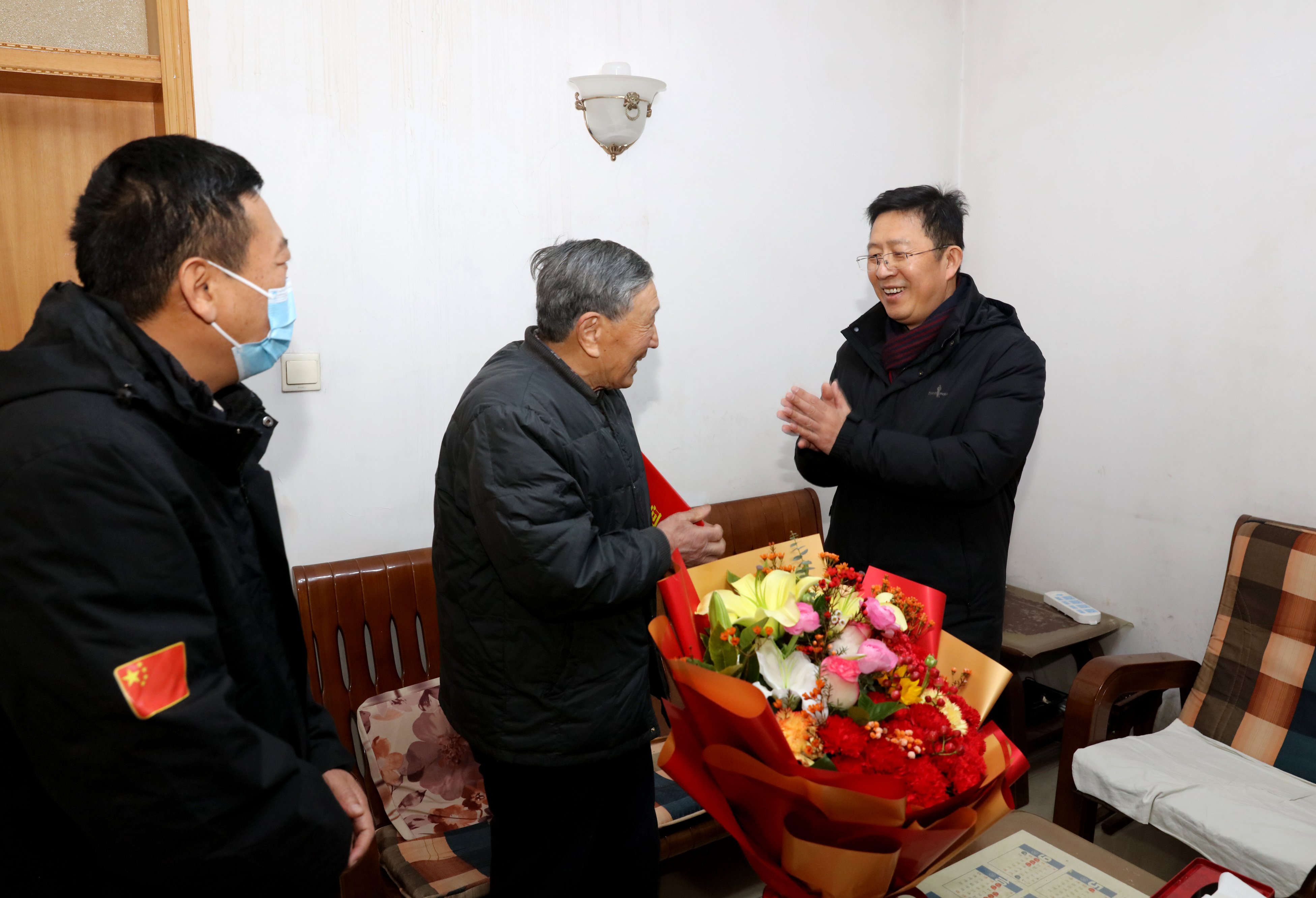 在全国先进工作者、退休干部董福顺家,王英超带着慰问品慰问金,送上鲜花和祝福,亲切询问董老师退休后的养老情况和家庭现状。看到84岁的董老师依然精神矍铄,王英超非常欣慰,感谢他为社会做出的贡献,祝愿他身体健康,事事顺心。