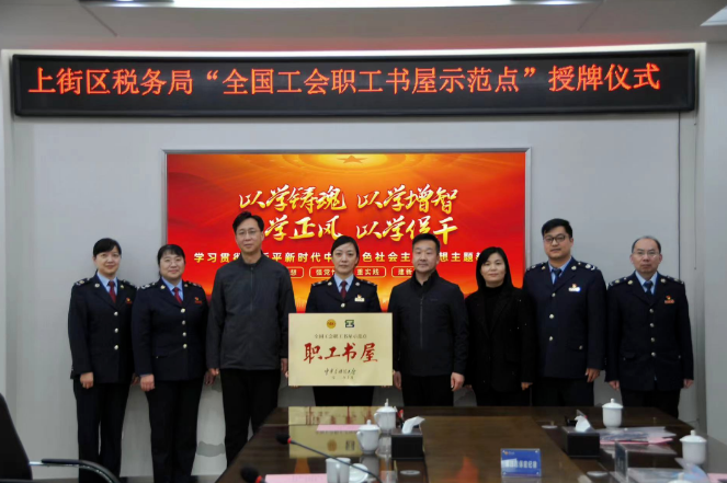 1月9日,市总工会党组成员、二级调研员季文甫代表市总工会为上街区税务局授发“全国工会职工书屋示范点”奖牌。郑州市税务局党委委员、副局长韩鹏,上街区总工会常务副主席雪洁等参加授牌仪式。