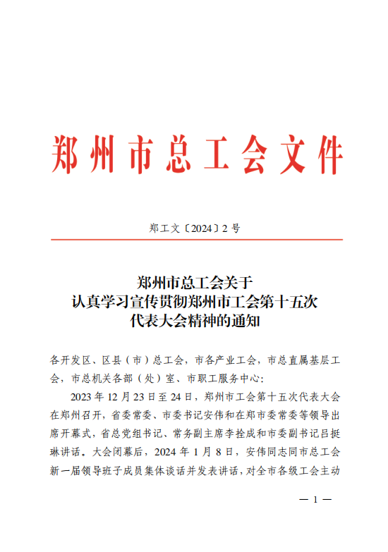 《通知》指出,市工会十五大是在全市上下全面贯彻党的二十大精神、高质量建设国家中心城市、加快推进中国式现代化郑州实践的关键时期召开的一次重要会议。大会以习近平新时代中国特色社会主义思想为指导,全面贯彻党的二十大精神,深入贯彻习近平总书记关于工人阶级和工会工作的重要论述,落实市委、省总部署要求,全面总结郑州市工会十四大以来的成就和经验,深入分析工会工作面临的新形势,明确今后五年工会工作的指导思想和目标任务,选举产生市总工会新一届领导机构。省委常委、市委书记安伟在同市总工会新一届领导班子成员集体谈话时发表讲话,为做好我市工会工作明确了方向、提出了更高要求。大会对于团结动员全市职工以主人翁精神和主力军姿态投身中国式现代化建设郑州实践,对于推动郑州工人运动和工会工作高质量发展,具有十分重要的意义。全市各级工会和广大工会工作者要深刻理解市工会十五大的重要意义精神实质,深刻领会坚持党的领导是做好工会工作的政治原则和根本保证,深刻领会组织动员全市广大职工群众为加快推进中国式现代化郑州实践而团结奋斗是工会工作的中心任务,深刻领会维护职工合法权益、竭诚服务职工群众是工会的基本职责,深刻领会维护劳动领域政治安全是工会组织的一项重大政治任务,深刻领会深化工会改革和建设是工会永葆生机活力、当好桥梁纽带的动力所在。